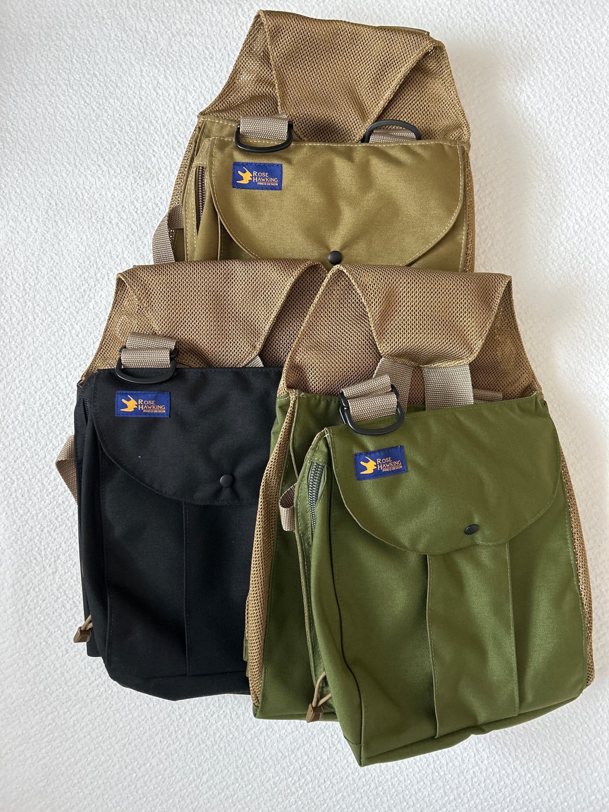 The hawking bags and game bag are constructed of 1000 denier water and blood proof Cordura© nylon fabric, worn comfortably by the user with highly adjustable shoulder straps and front closure. Pocket closures are best quality nylon zippers and solid brass snaps. Everything works one-handed easily, by left or right-handers, with or without gloves. Heavy-duty mesh panels on 3 secure, zippered compartments assure quick cooling of killed game. You can carry telemetry receivers and antennas in one of the front compartments or the rear game bag compartment. Made in the USA.
